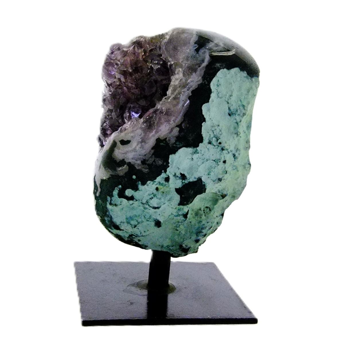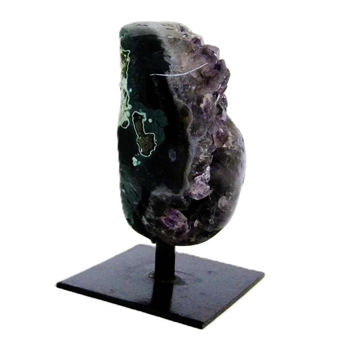 Agate Rimmed Amethyst Druze/ Geode Specimen Featuring Polished Edge And Metal Stand.