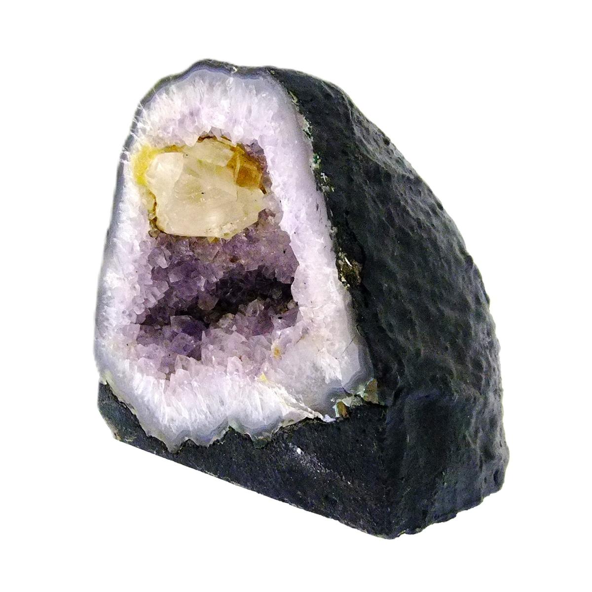 This cave features polished cut front face with Calcite crystal formation inside also flat base to stand.