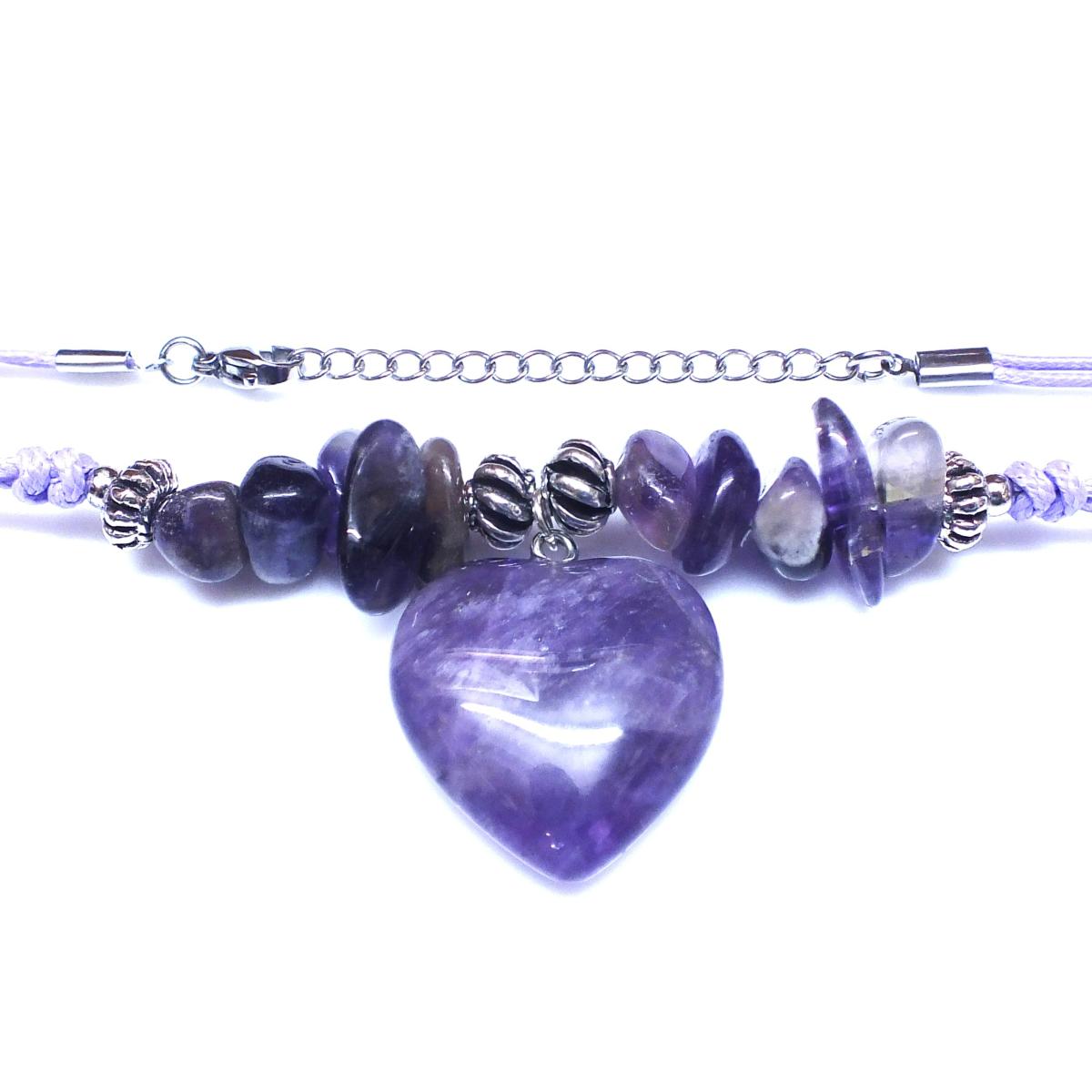 Chip & Bead Necklace Featuring Amethyst & Silver Plated Beads And a Heart Pendant On Purple Cord With Lobster Style Clasp With Extender Chain.