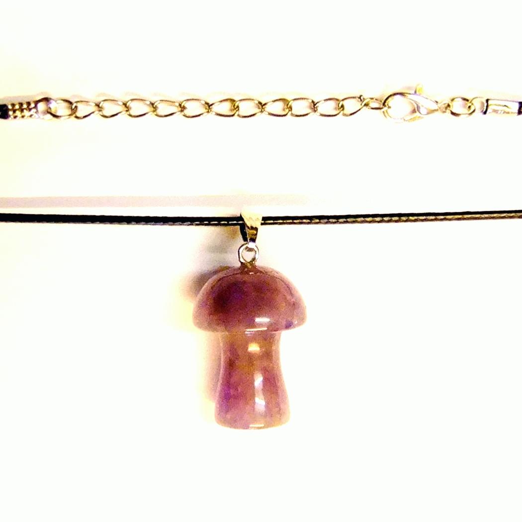 Gemstone Mushroom Pendant in Amethyst with silver plated bail on a waxed cord with lobster style clasp.