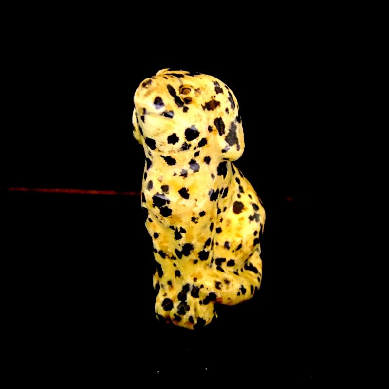 Gemstone Sitting Dog Figure carved in Dalmatian Jasper.