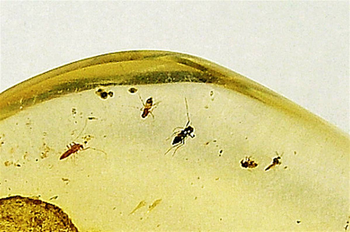 FEATURES VARIOUS SPECIES OF SMALL INSECTS TRAPPED WITHIN.
