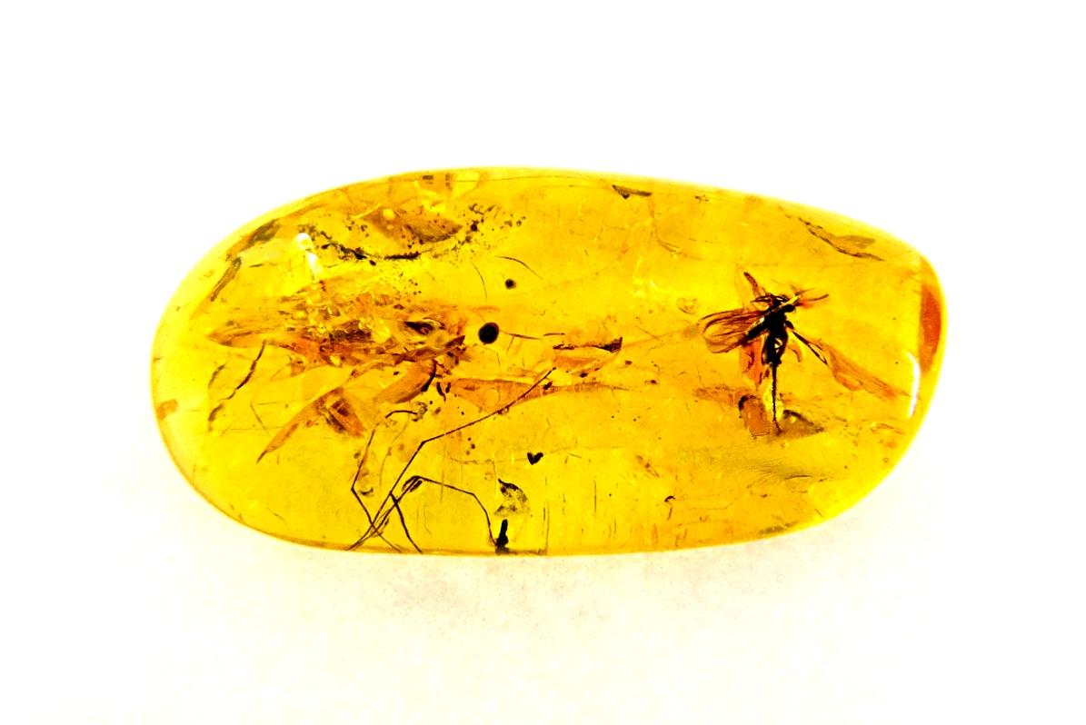 POLISHED AMBER SPECIMEN WITH INSECT INCLUSIONS.
